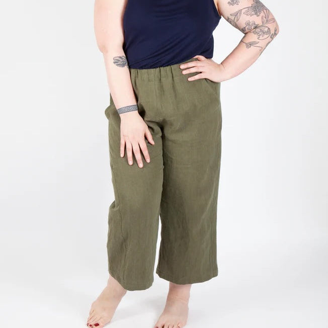 From the designer: The Free Range Slacks are casual, comfortable, and timeless high-waisted pants with your choice of a wide or tapered leg. Both options have an elastic high waist, side panels, topstitched front pockets, and optional back patch pocket(s). The instructions include options for French and flat-fell leg seams.